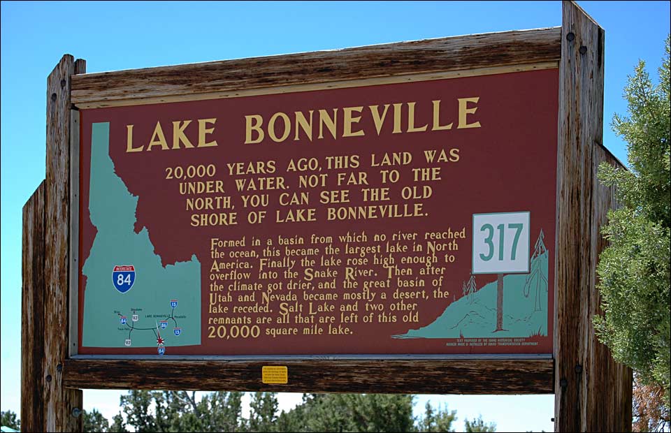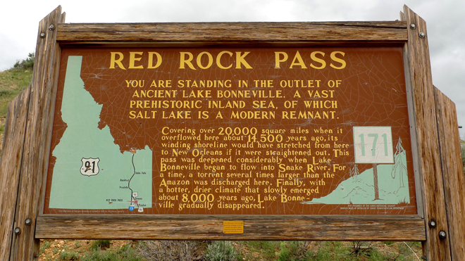 The Flood Event: Red Rock Pass is a narrow valley just north of Cache Valley and directly south of Downey Idaho. It is bounded by two mountain ranges; the Portneuf to the East and the Bannock to the West. The pass is a tertiary normal faulted graben consisting of tuffaceous fine-grained clastics and carbonates of the Salt Lake formation overlain by unstable Quaternary Alluvial fan gravels carved out by a massive flooding event roughly 14,500 years ago. During the Quaternary, alluvial gravels from the two ranges coalesced to create a saddle shaped dam. The rising Lake Bonneville was halted by this alluvial dam at the Zenda threshold approximately 16 thousand years ago. The threshold was first breached to the east side of Red Rock Pass, at about 14,500 years ago, eroding out the alluvial fan. Its base level was controlled by the resistant karstic limestone of the Blacksmith Formation. The outflow ultimately slid to the west undercutting the alluvium at the foot of the Bannock and prompting a 17 square kilometer landslide. This landslide was then truncated by the flood causing massive flood deposits of alluvial gravel under what are now Downey and the surrounding valley. From the break point at Red Rock Pass, the flood route flowed into the Marsh Creek Valleys, through the Portneuf Narrows and into Snake River Plain just North of Idaho. From there if followed the Snake River Canyon into Michaud Flats and up to Lewiston, where confirmation of the Bonneville Flood is obscured by the effects of the Missoula Flood.